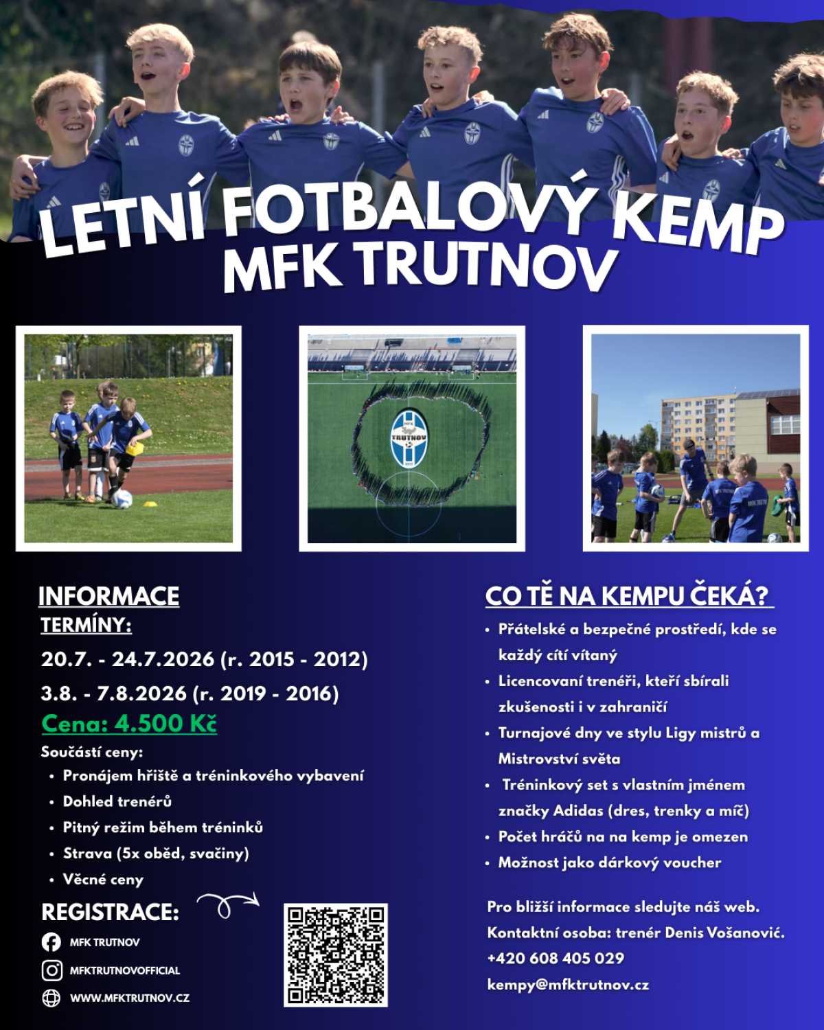 Letní fotbalový kemp MFK Trutnov 2026 REGISTRACE (klikni) Přihlas se k nám na fotbalový kemp, kde tě čeká tě spousta zábavy, zážitků a fotbalu od rána do odpoledne. Na kempu se můžeš těšit na: licencované trenéry se zkušenostmi ze zahraničí i klubového fotbalu zapojení h...